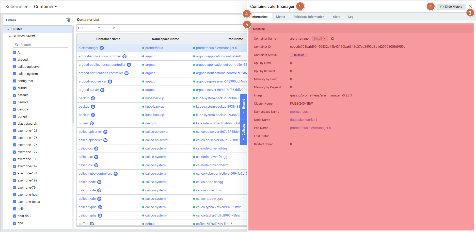 | 4 | Tab | Host 타입별 탭 클릭 시 해당 탭의 Detail Slide 화면을 보여줍니다. Information Metric Relational Information Alert Log |