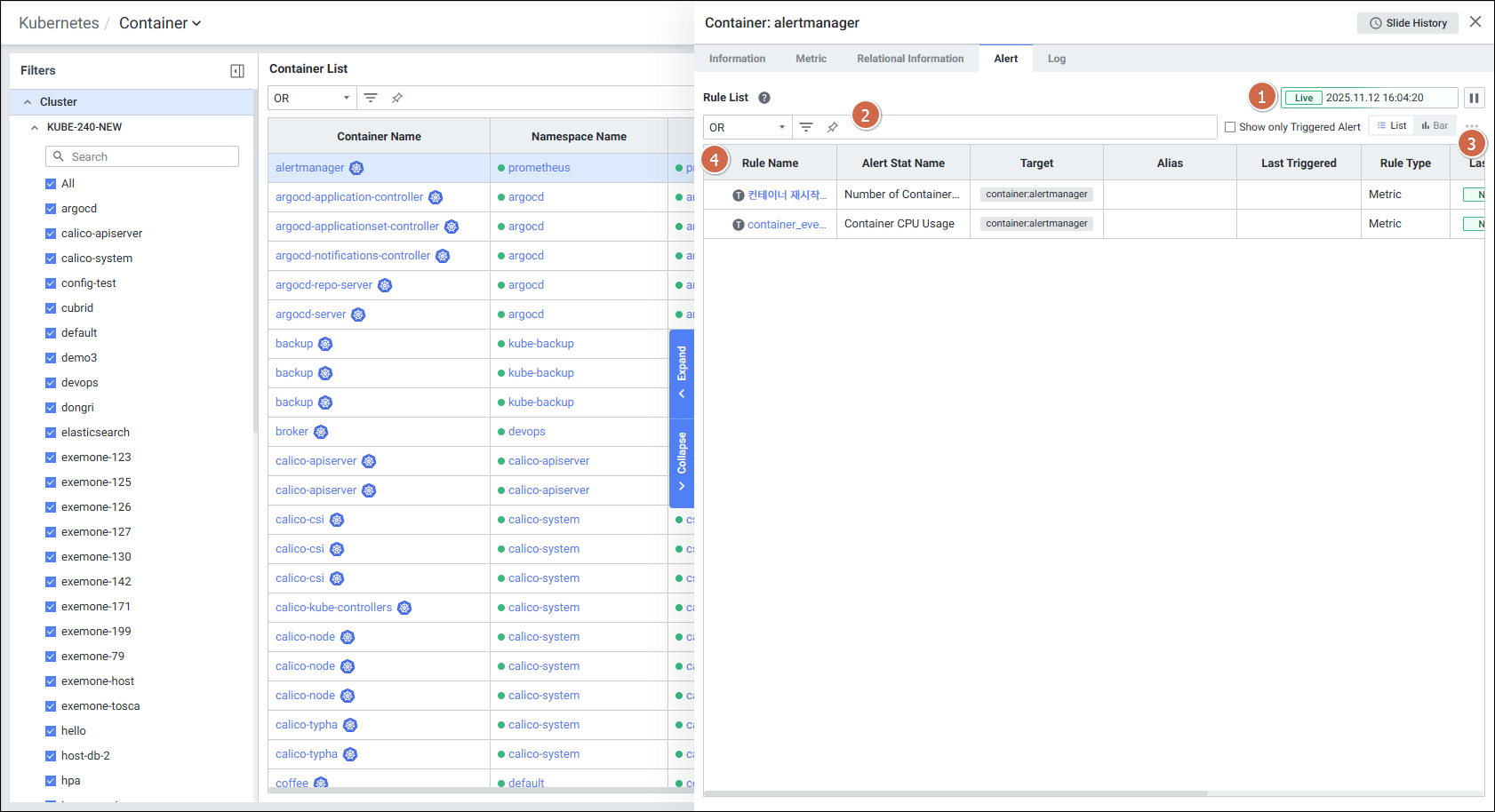 Container Detail Slide의 Alert 정보를 확인하는 화면입니다.