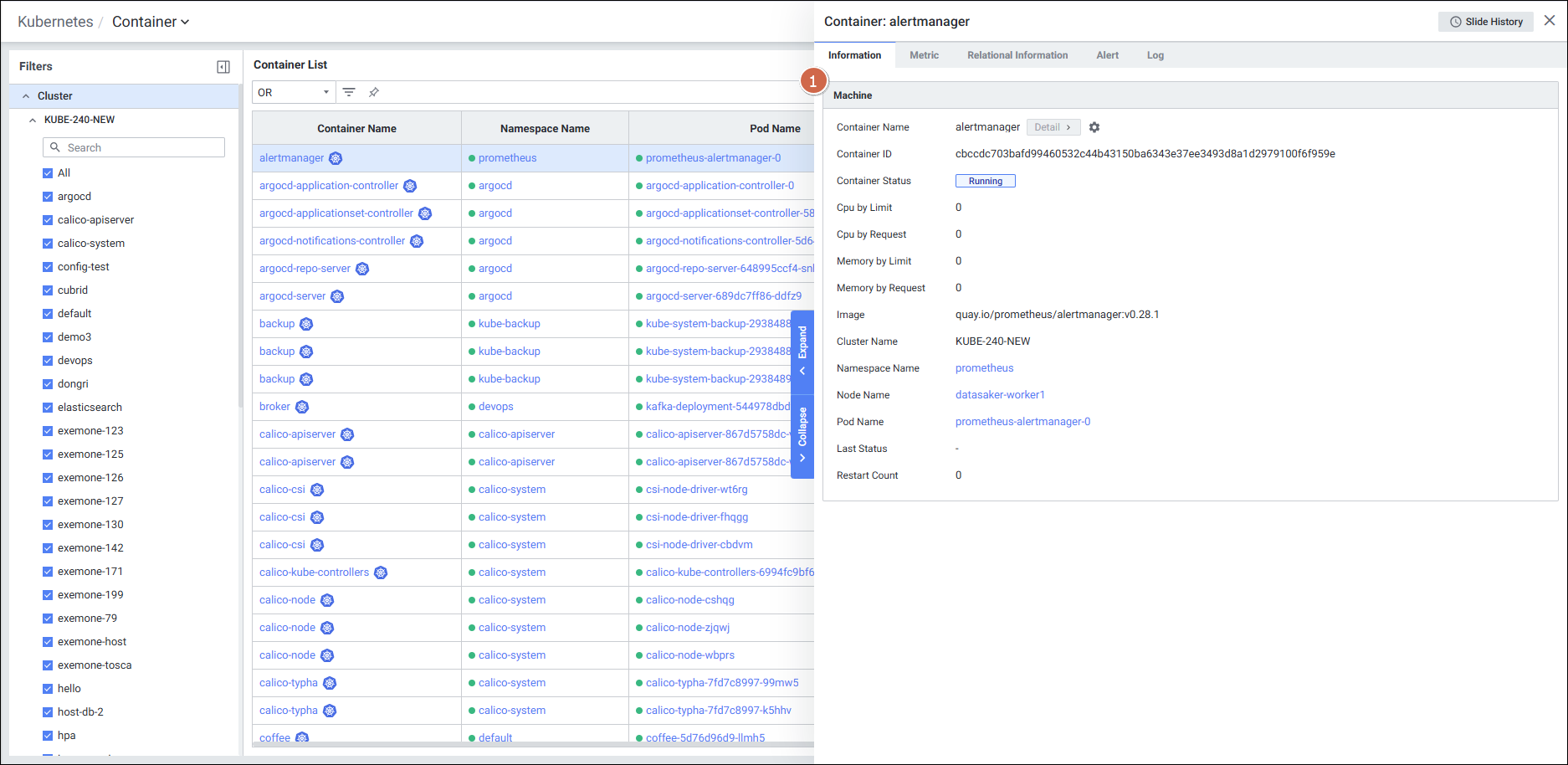 Container Detail Slide(K8S)의 정보를 확인하는 화면입니다.