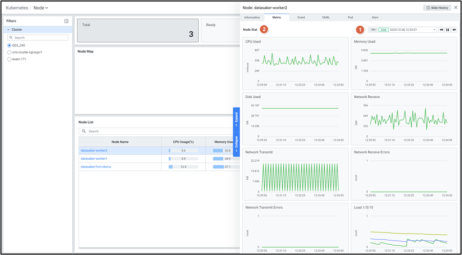 | 2 | Node Stat | 노드 지표를 보여줍니다. CPU Used Memory Used Disk Used Network Receive Network Transmit Network Receive Errors Network Transmit Errors Load 1/5/15 |