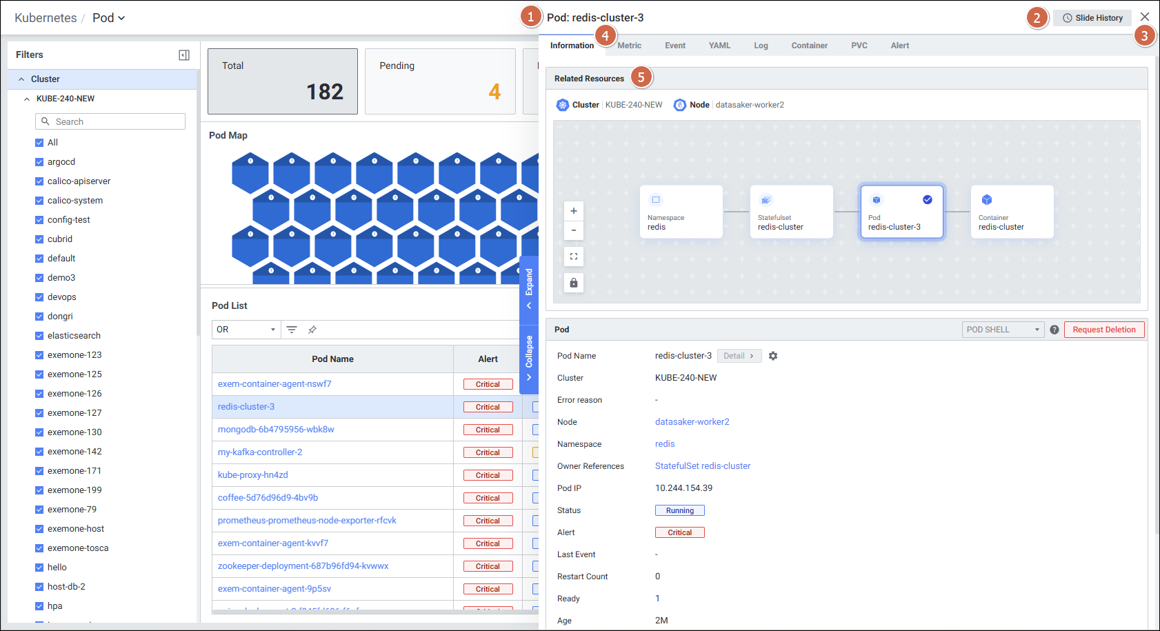 | 4 | Tab | 탭 클릭 시 해당 탭의 디테일 슬라이드 화면을 보여줍니다. Information Metric Event YAML Log Container PVC Alert |