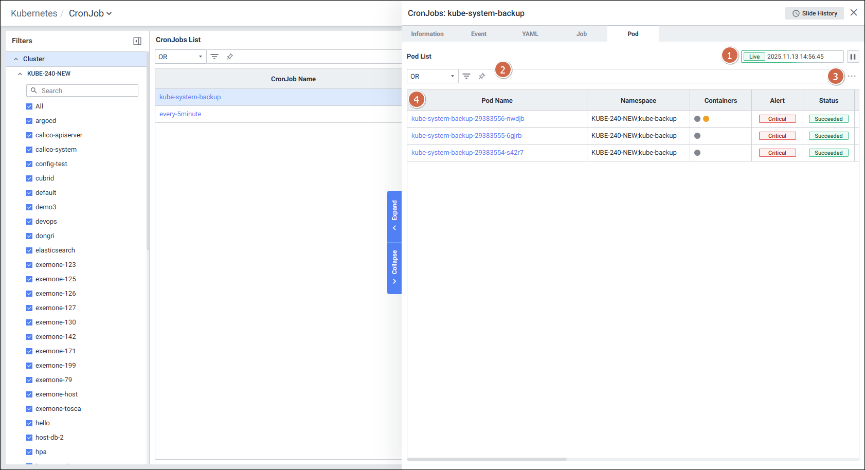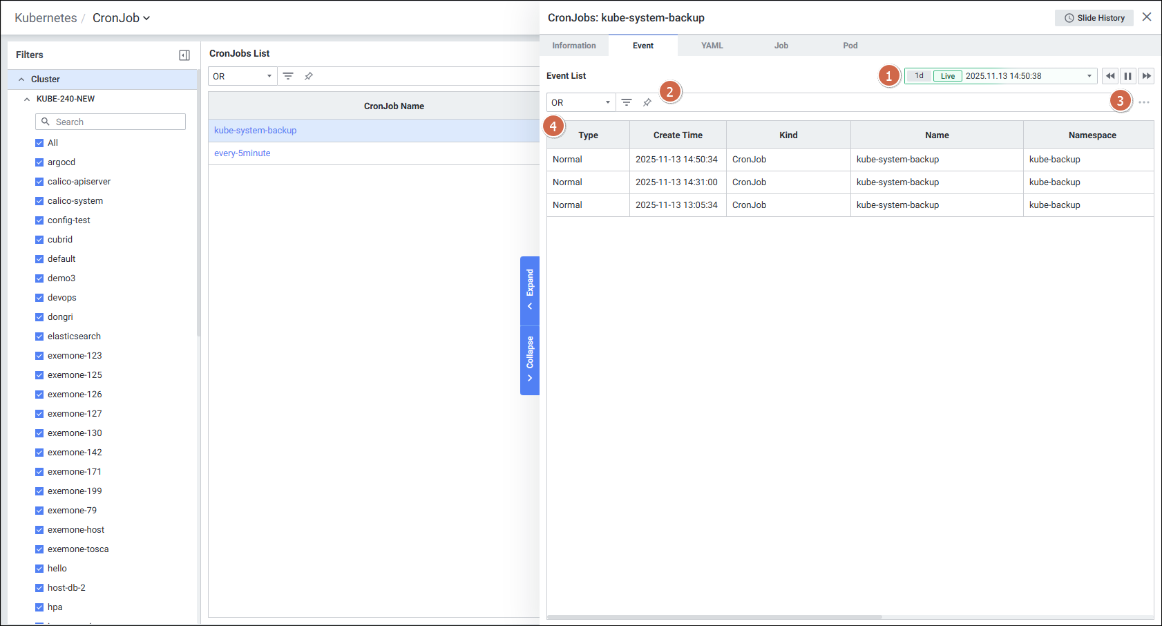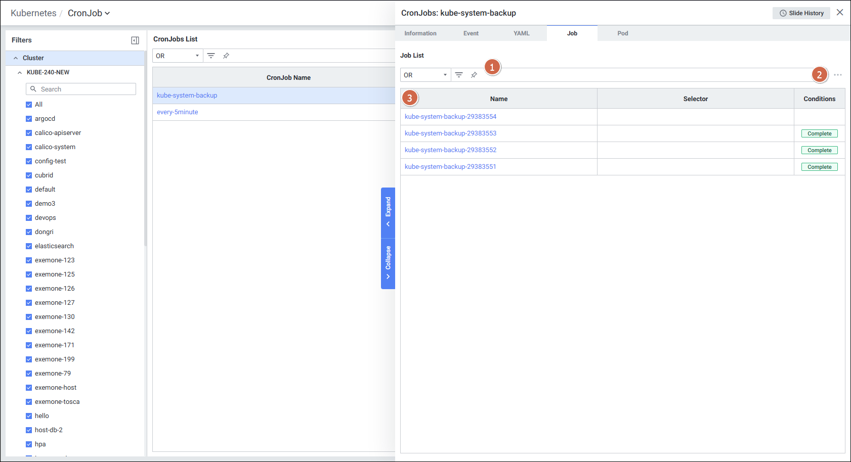 | 4 | Tab | 탭 클릭 시 해당 탭의 디테일 슬라이드 화면을 보여줍니다. Information Event YAML Job Pod |