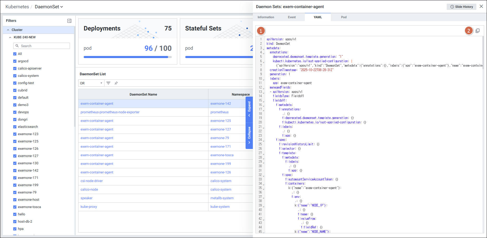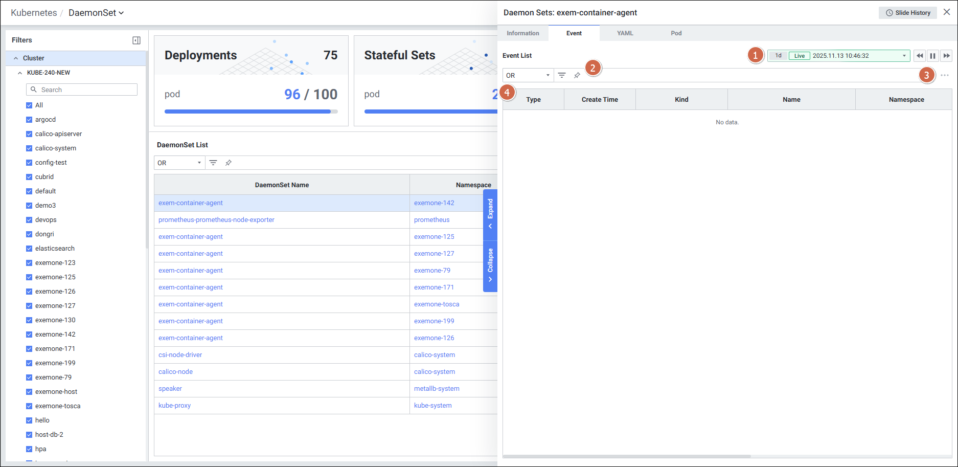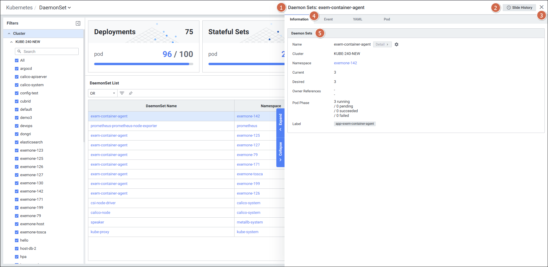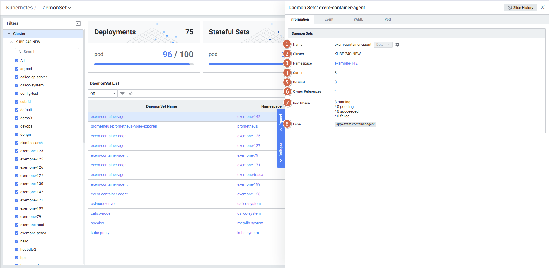 | 4 | Tab | 탭 클릭 시 해당 탭의 디테일 슬라이드 화면을 보여줍니다. Information Event YAML Pod |