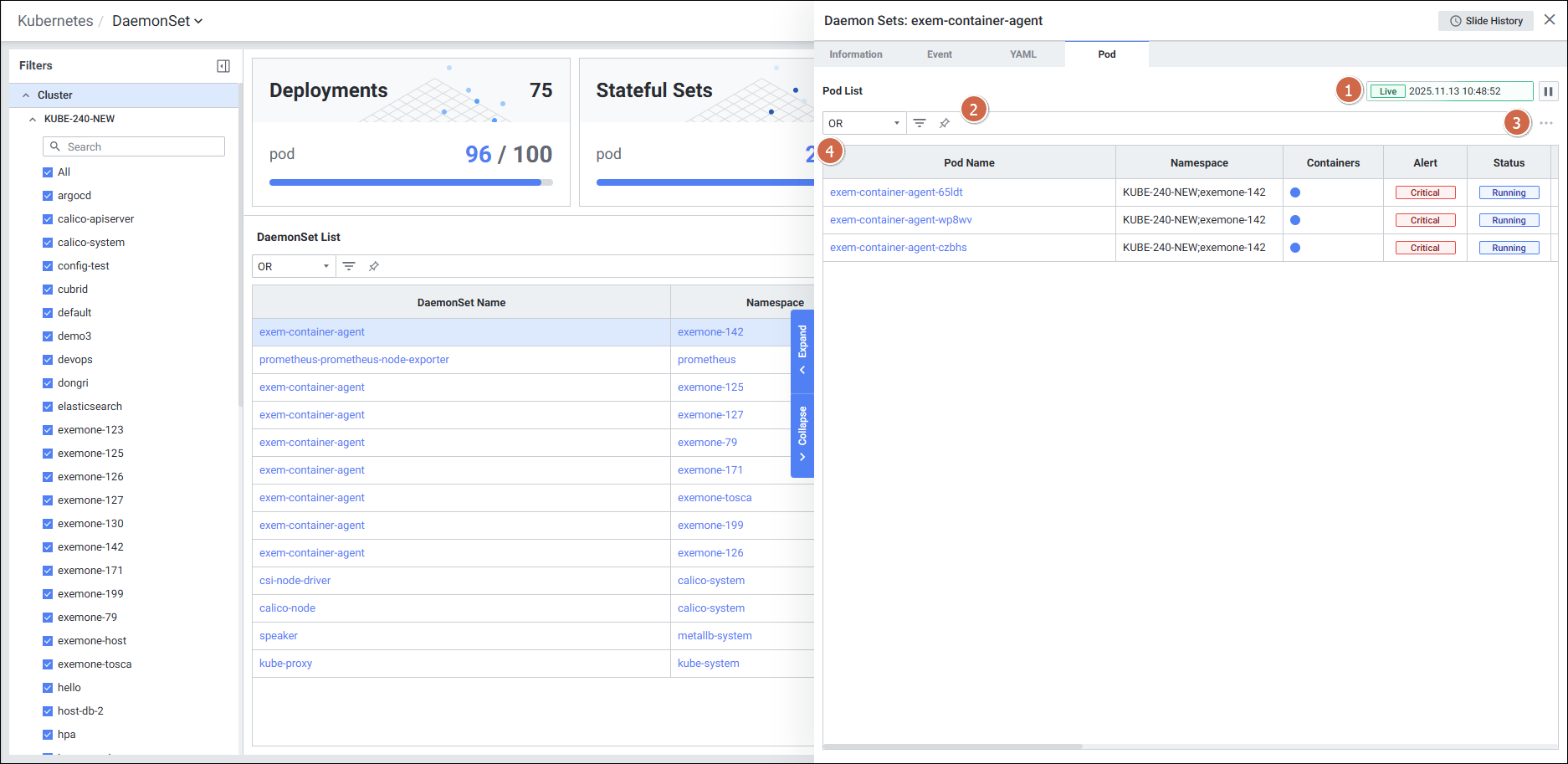 | 1 | Pod Name | 파드의 이름 (클릭 시 4.4.4. Pod Detail Slide 오픈) |