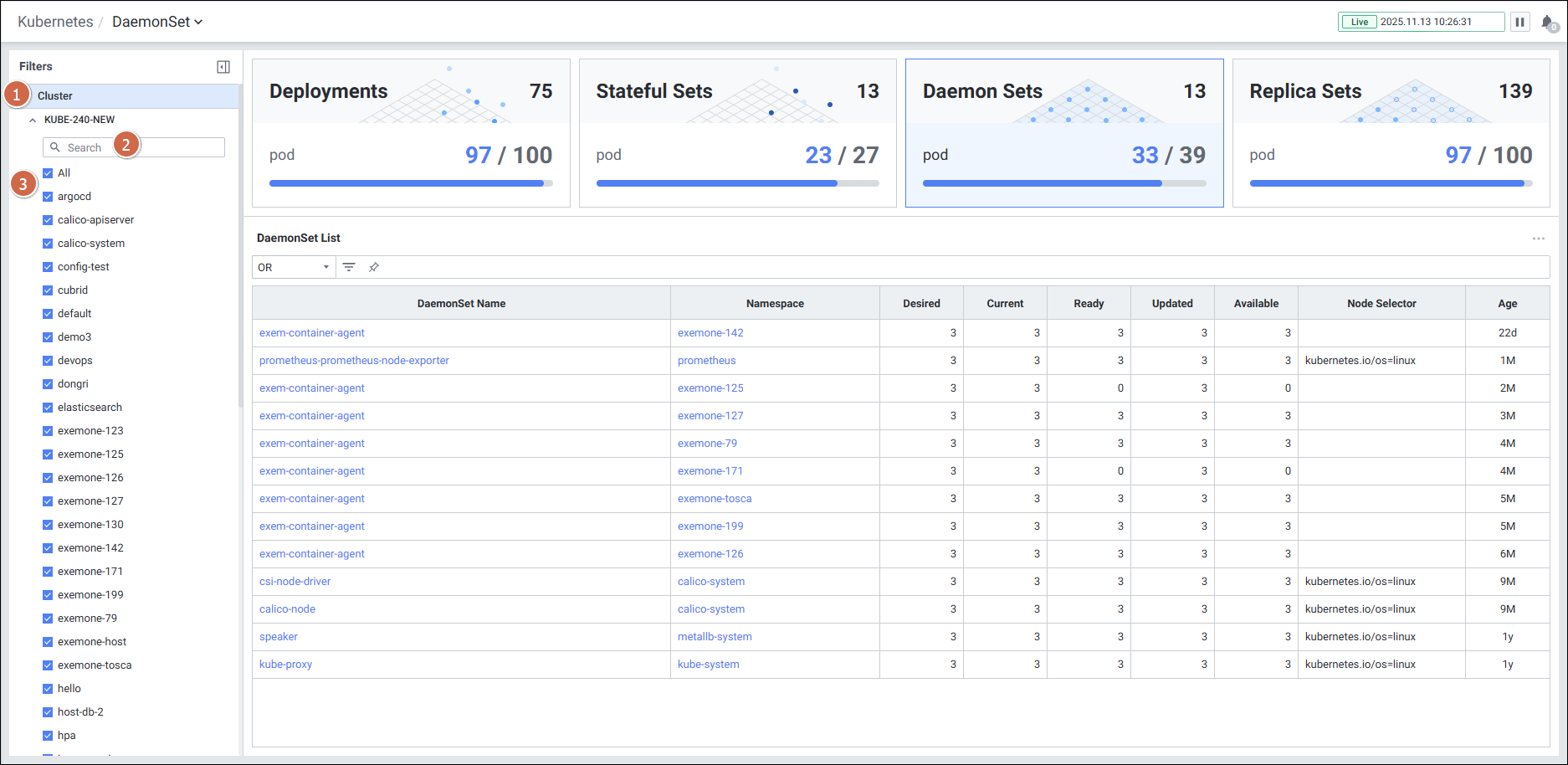 1Cluster클러스터 하위의 필터 항목을 보여줍니다.