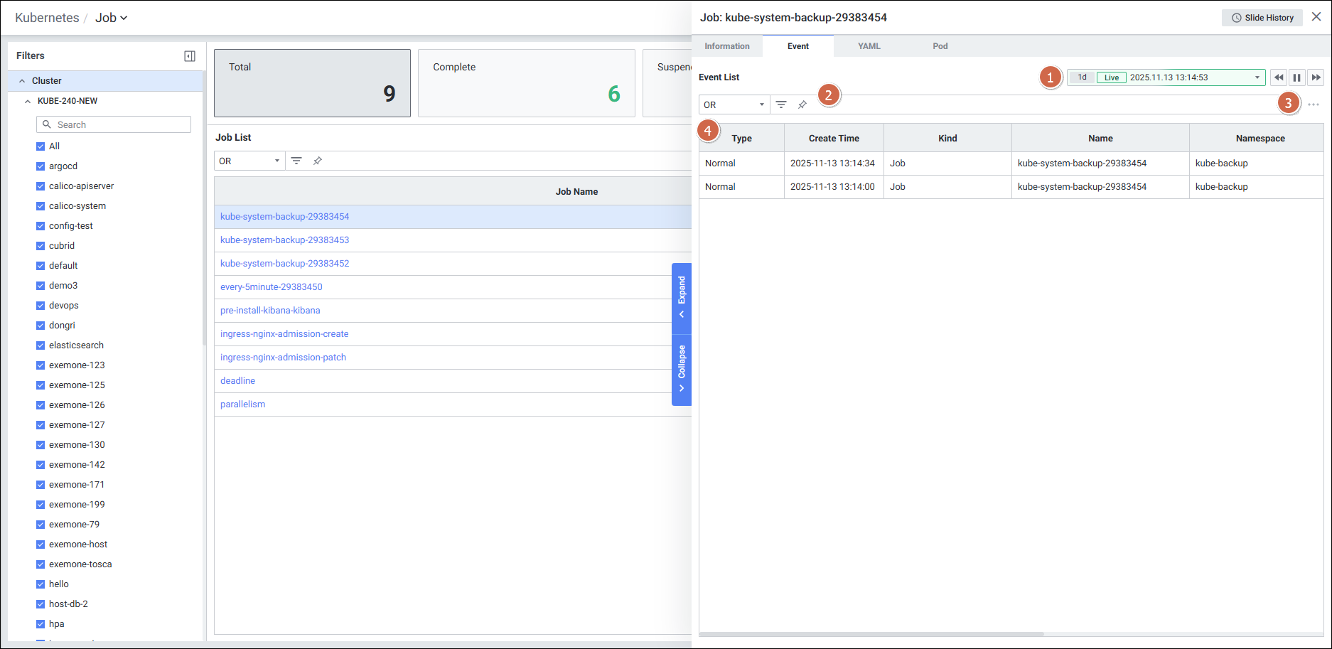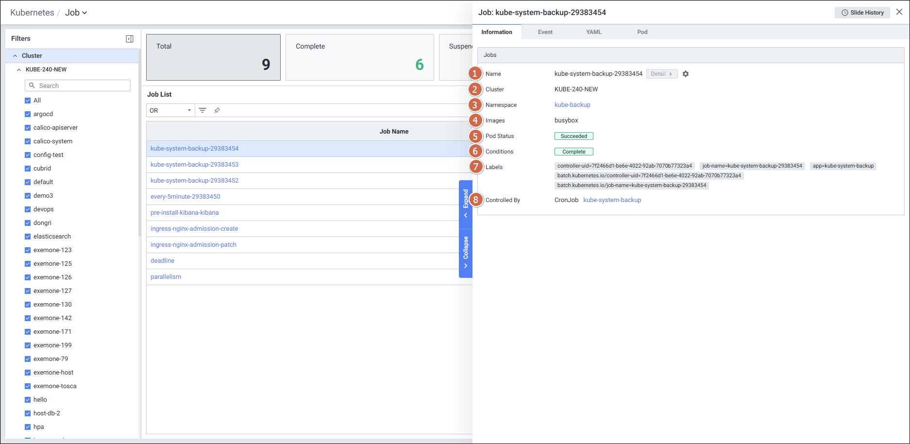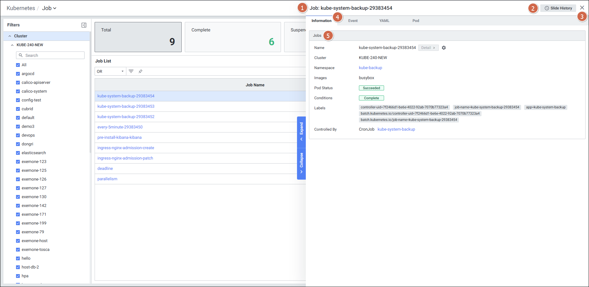 | 4 | Tab | 탭 클릭 시 해당 탭의 디테일 슬라이드 화면을 보여줍니다. Information Event YAML Pod |
