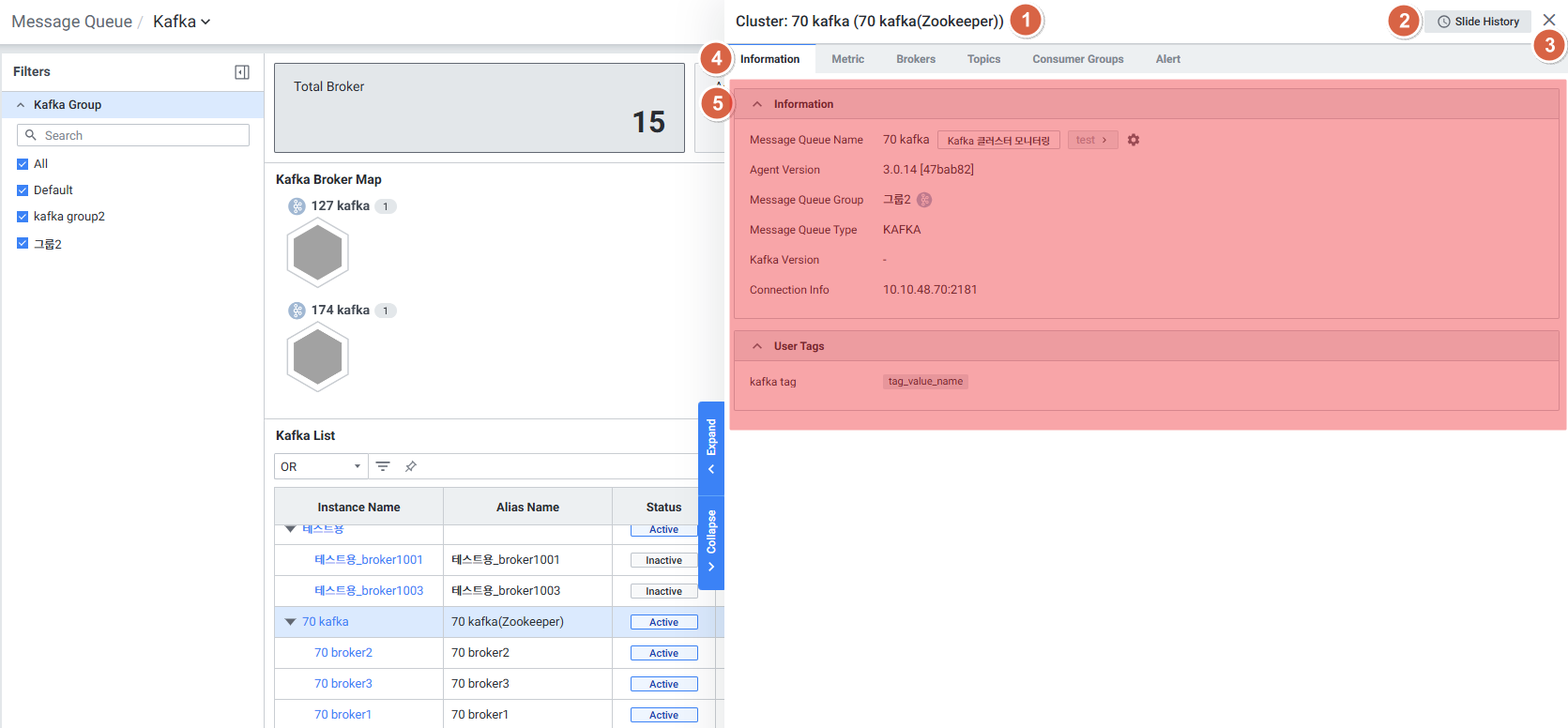 | 4 | Tab | Kafka 타입별 탭 클릭 시 해당 탭의 Detail Slide 화면을 보여줍니다. Information Metric Brokers Topics Consumer Groups Alert 정보 탭이 기본적으로 동일하지만, Metric, Brokers, Topics, Consumer Groups 등은 각각의 Kafka 특성에 맞게 다양한 정보를 제공합니다. |
