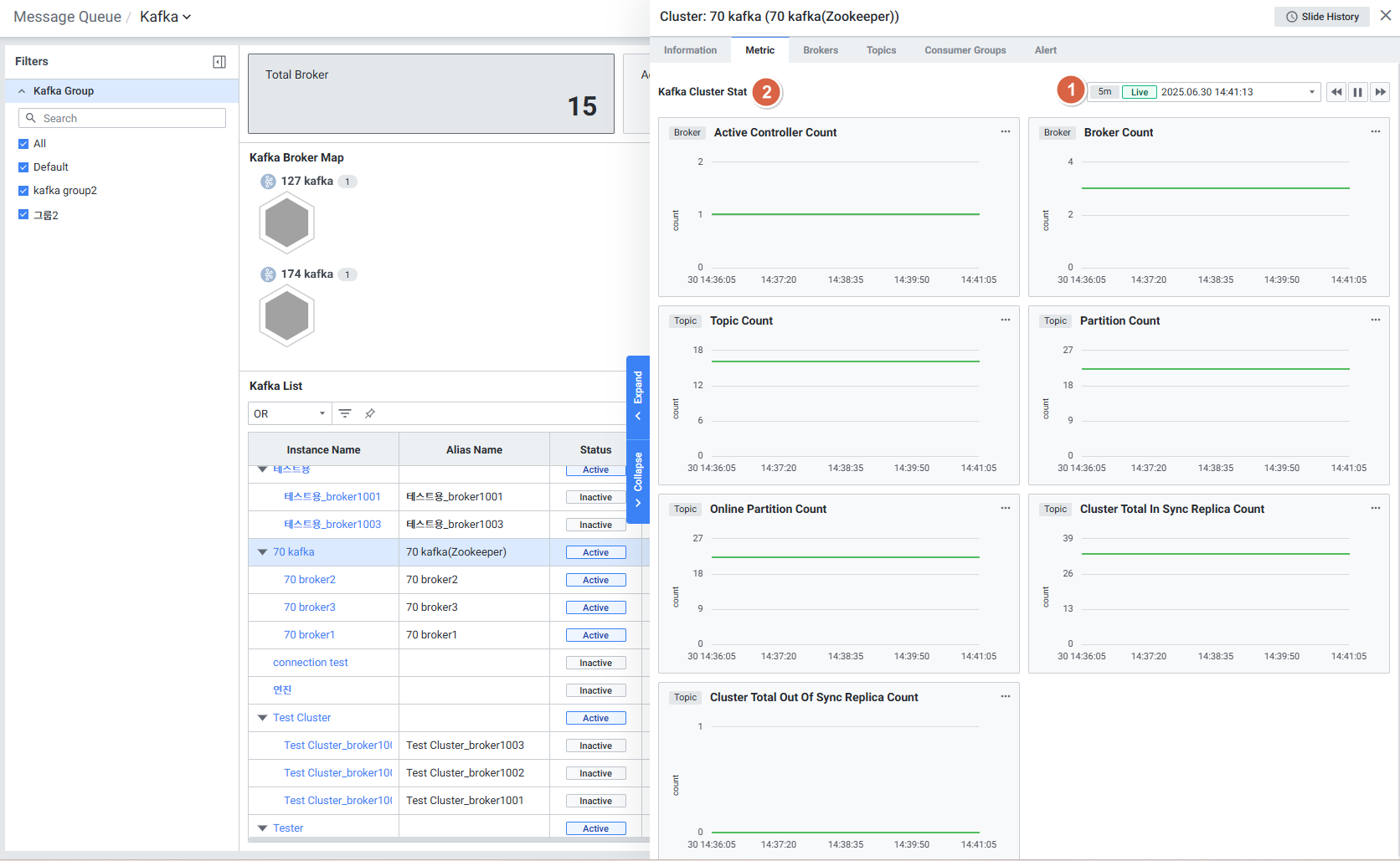 | 2 | Kafka Cluster Stat | Cluster 내의 모든 Broker에 대한 지표를 보여줍니다. Active Controller Count Broker Count Cluster 내의 모든 Topic 에 대한 지표를 보여줍니다. Topic Count Partition Count Online Partition Count Cluster Total In Sync Replica Count Cluster Total Out Of Sync Replica Count |