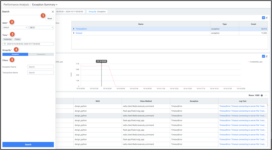 Exception: Exception을 기준으로 그룹핑 한 데이터를 보여줍니다. 특정 Exception이 발생한 Transaction을 확인 할 수있습니다.