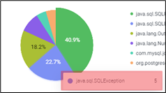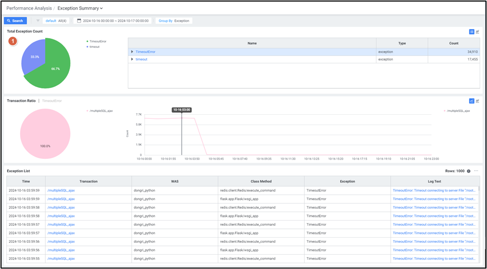 검색 패널의 Group By 조건이 Exception일 경우 Total Exception Count를, Transaction일 경우 Total Transaction Count를 보여줍니다. Exception 또는 트랜잭션의 카운트의 분포도를 제공하는 화면입니다.