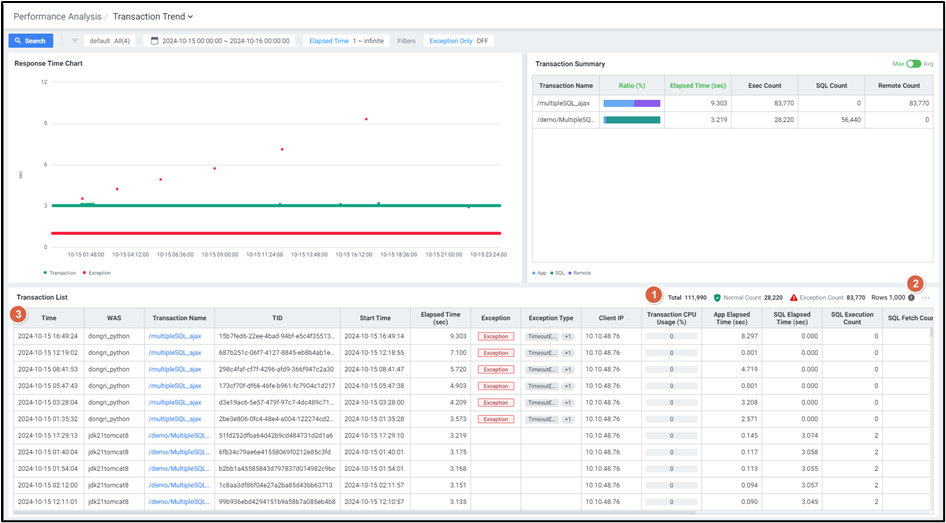 | 3 | Grid | 응답 시간 차트에서 드래그 할 경우, 이에 대해 해당하는 트랜잭션 상세정보를 보여줍니다. 트랜잭션 서머리에서 특정 행 클릭 시, 이에 대해 해당하는 트랜잭션 상세정보를 보여줍니다. 컬럼은 페이지 단위로 정렬됩니다. |