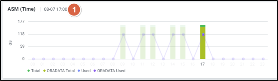 | 1 | Chart | ASM (Time) Chart에서 Used가 가장 큰 값을 가진 시간대가 하이라이팅 처리되어 보여집니다. 선택된 시간은 Title 우측에 보여줍니다. Chart에서 특정 시간을 선택하면 선택한 시간에 대해 ASM Group영역이 변경되어 보여집니다. |