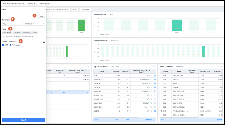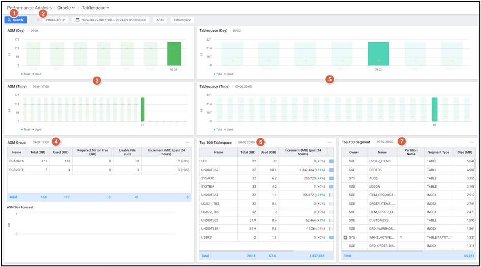 | 4 | ASM & Tablespace | Search Pannel에서 ASM과 Tablespace 중 조회 할 데이터를 선택합니다. ASM, Tablespace 체크박스는 Default로 선택됩니다. |