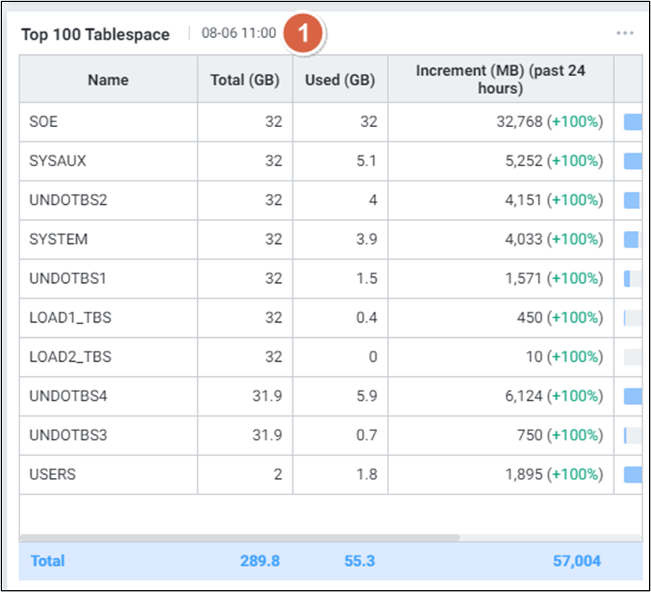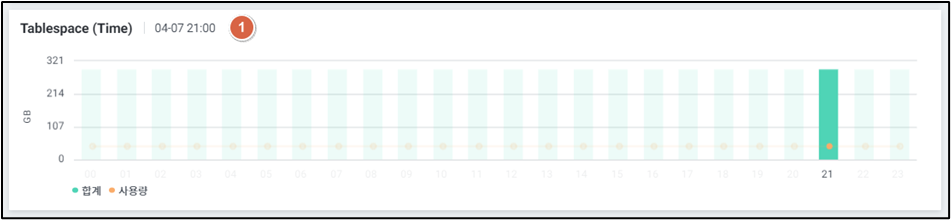 | 1 | Chart | Tablespace (Time) Chart에서 Used가 가장 큰 값을 가진 시간이 선택된 상태로 보여집니다. 선택된 시간은 Title 우측에 보여줍니다. Chart에서 특정 시간을 선택하면 Top 100 Tablespace와 Top 100 Segment Title 영역에 Time 값이 변경됩니다. |
