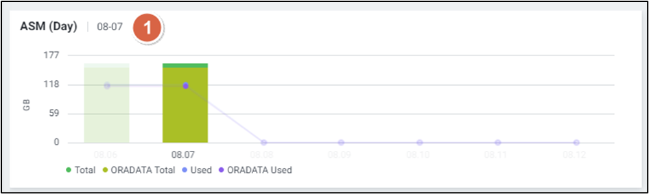 | 1 | Chart | ASM (Day) Chart에서 Used가 가장 큰 값을 가진 일자가 하이라이팅 처리되어 보여집니다. 선택된 일자는 Title 우측에 보여줍니다. Chart에서 특정 일자의 값을 선택하면 ASM (Time)과 ASM Group영역에 값이 변경됩니다. |
