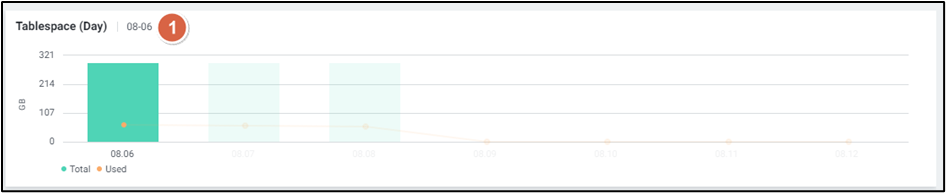 | 1 | Chart | Tablespace (Day) Chart에서 Used가 가장 큰 값을 가진 일자가 선택된 상태로 보여집니다. 선택된 일자는 Title 우측에 보여줍니다. Chart에서 특정 일자의 값을 선택하면 Tablespace (Time), Top 100 Tablespace와 Top 100 Segment Title 영역의 일자 값이 변경됩니다. |