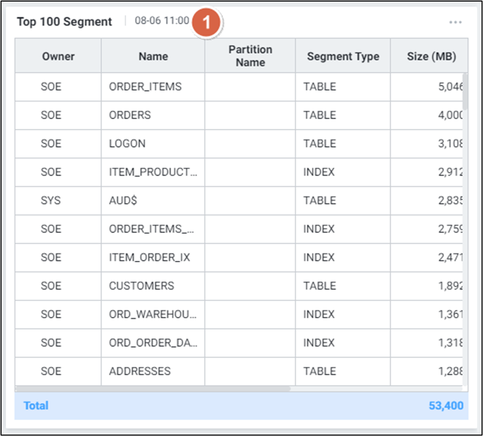 | 1 | Grid | Size 기준으로 내림차순 하여 Top 100개를 노출하여 보여줍니다. Top 100 Tablespace에서 선택된 행 기준으로 Top 100 Segment를 보여줍니다. Partition Name 열의 값이 Y인경우 계층구조 행으로 보여줍니다. |