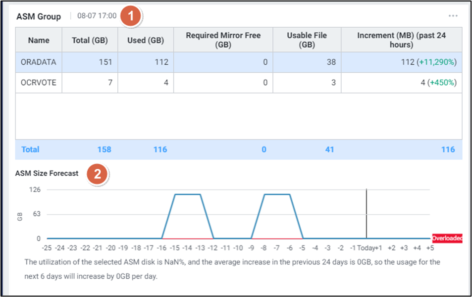 | 4 | ASM Group | ASM Group Grid 화면에서는 ASM Disk Group 별 사용량을 출력합니다. ASM Size forecast: 선택한 ASM Group의 Size를 하루 전 시점과 비교하여 증감량을 보여줍니다. |
