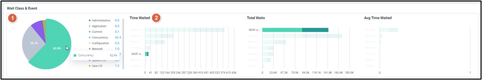 각 pie (Wait Class)를 선택할 시, 선택된 Wait Class의 Event로 오른쪽 막대그래프를 보여줍니다.