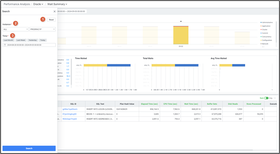 각 일자의 Stack Bar를 선택하면 Wait Class & Event 영역과 Wait SQL List의 데이터가 해당 날짜에 대한 데이터로 변경됩니다.