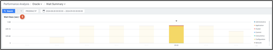 3Wait Class (sec)Search Pannel에서 조회한 기간의 일별로 Wait Class의 비율을 Stack Bar 형태로 보여줍니다.