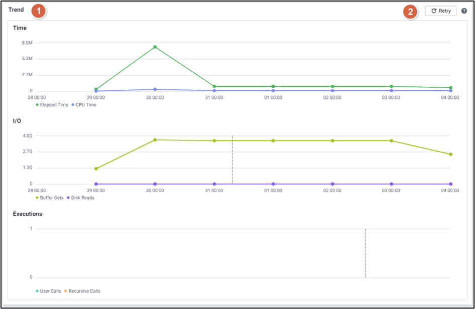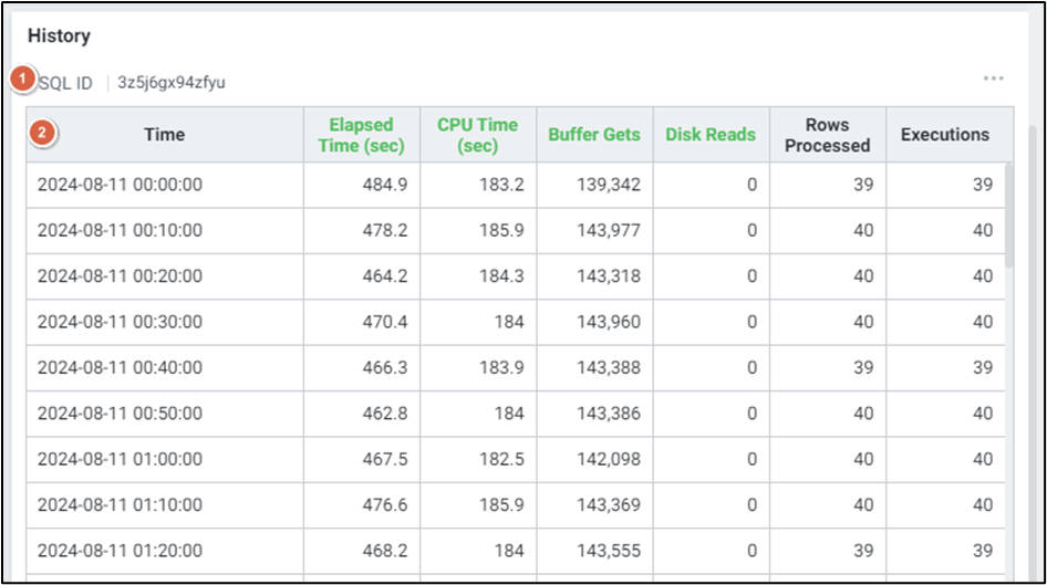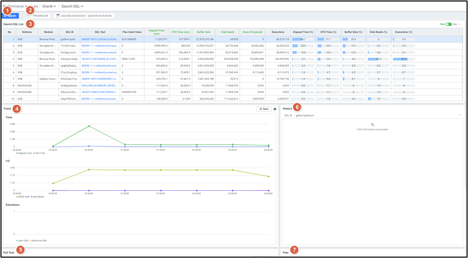 | 1 | Grid | Elapsed Time 기준 Top-1 SQL이 자동 선택되며, 3가지 주요 지표를 트렌드 영역에 보여줍니다. 다른 SQL을 클릭할 경우 트렌드 영역의 값이 함께 변경되며, 선택한 SQL ID 값이 History 영역 하단에 출력됩니다. |