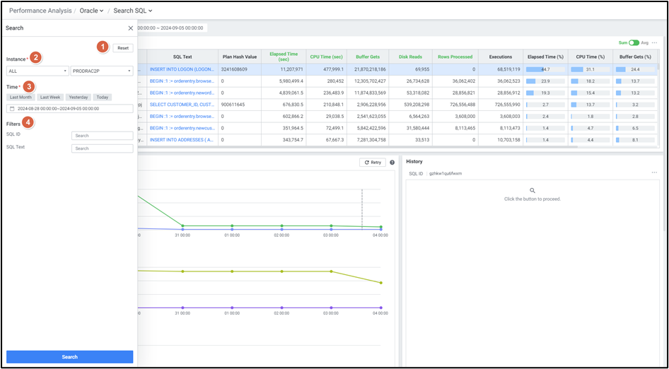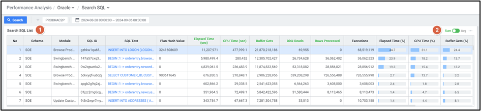 | 4 | Filters | Search 조건을 입력합니다. SQL ID : 대소문자는 구분하지 않으며 전체 일치만 검색이 가능합니다. SQL Text : 대소문자는 구분하지 않으며 일부 일치 검색이 가능합니다. |