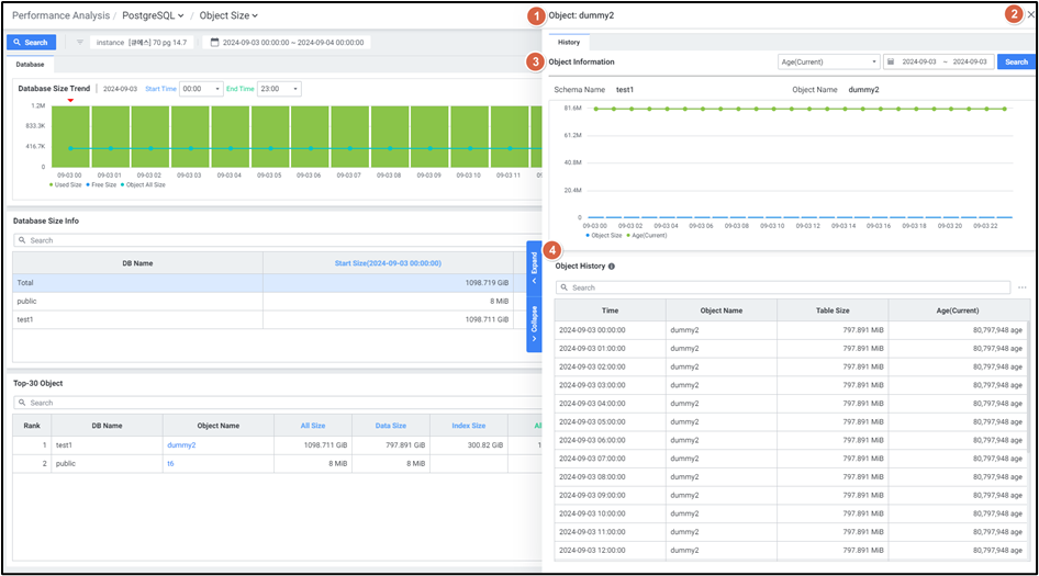 | 2 | Grid | Database Size Trend에서 선택한 시간에 대해 DB Name별 Start Time Size, End Time Size, Diff Size를 확인합니다. Grid에서 특정 행을 클릭했을 경우, Top-30 Object의 값이 변경됩니다. |