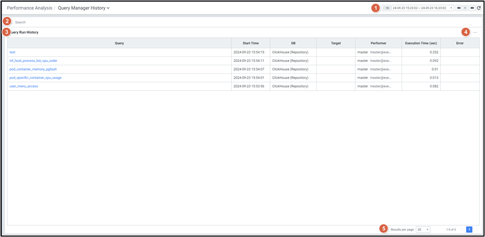 | 1 | Global Time | 실시간을 포함한 최근 쿼리 데이터를 보여줍니다. Default 최근 10분 데이터를 보여줍니다. 13.4. Global Time 참고 |