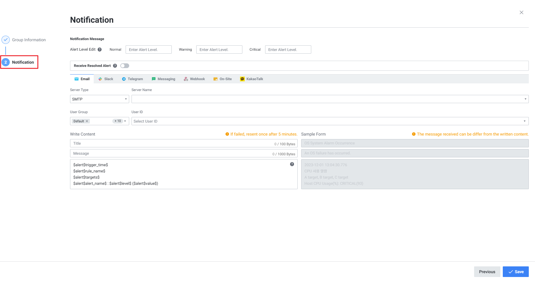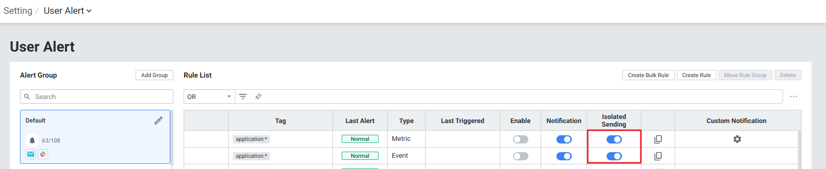 그룹 알람은 개별알람 옵션(Rule List > Isolated Sending)이 비활성화일 경우 동작합니다.