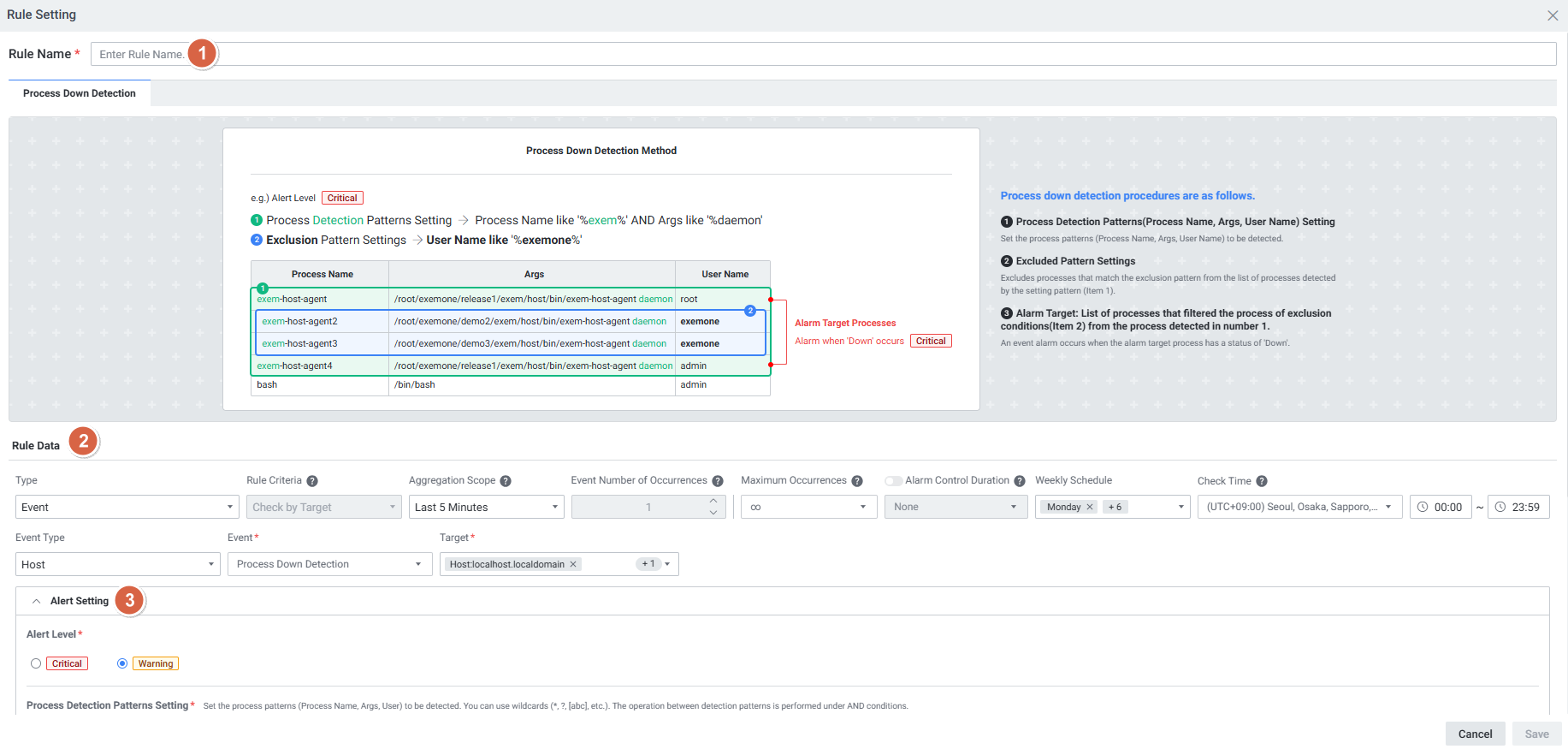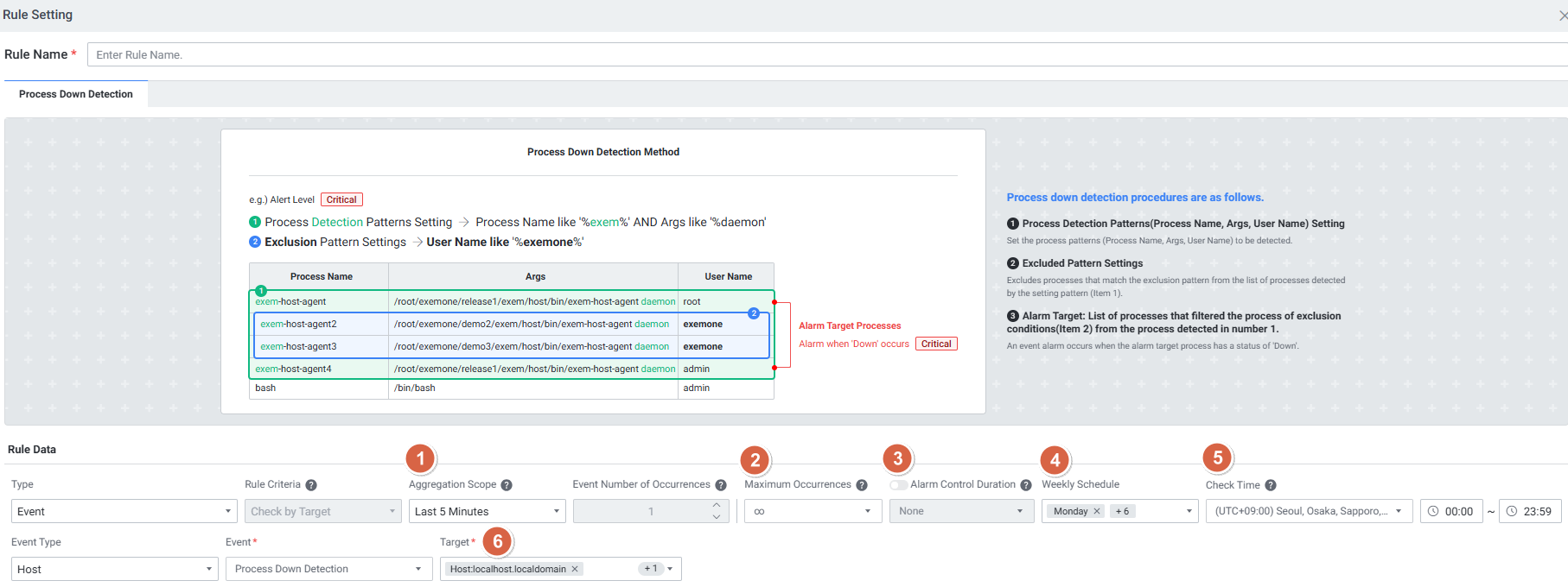 Event=Process Down Detection Host 타겟에서 구동 중인 프로세스 종료 시, 알람이 발생됩니다.