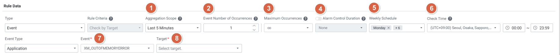 2Event Number of Occurrences설정한 임계 값을 체크하는 횟수를 입력합니다. 임계값이 체크 반복 횟수에 도달하면 알람을 발생시킵니다.