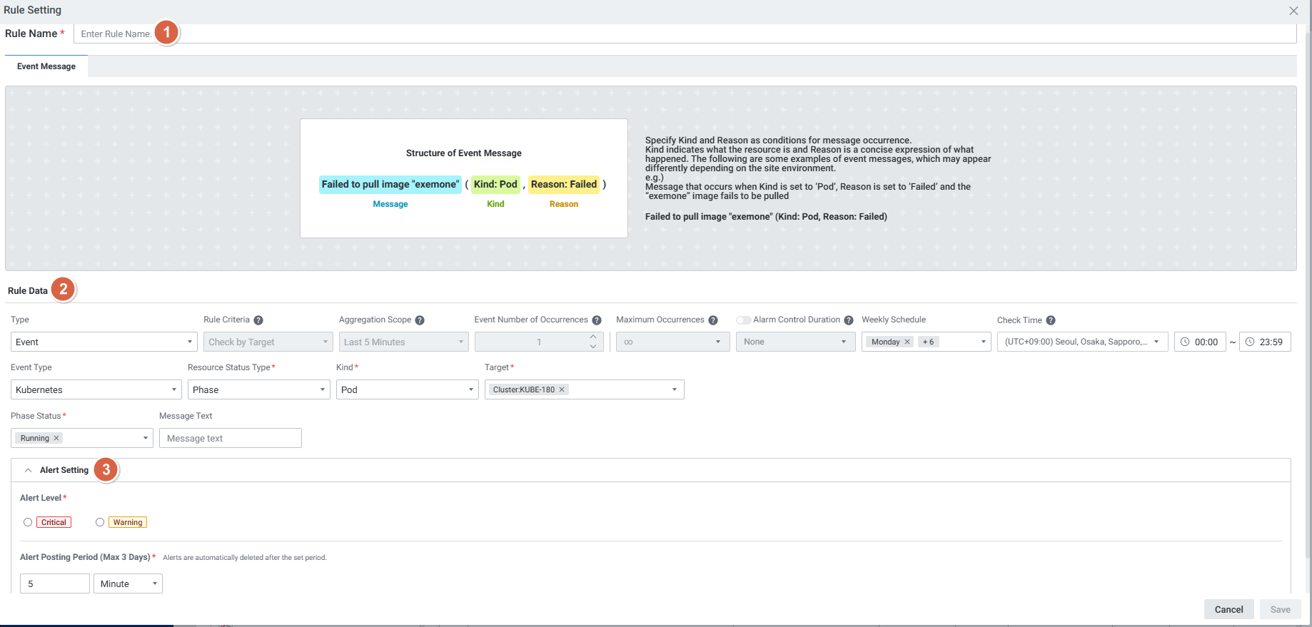 Resource Status Type=Phase Alert 발생 조건으로 Kind와 Reason을 설정하여 Alert을 수신할 수 있습니다.