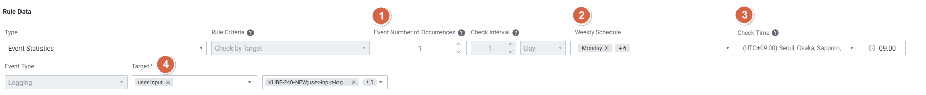 | 1 | Event Number of Occurrences | 설정한 임계 값을 체크하는 횟수를 입력합니다. 임계값이 체크 반복 횟수에 도달하면 알람을 발생시킵니다. 기본값: 3, 최소: 1, 최대: 100 |