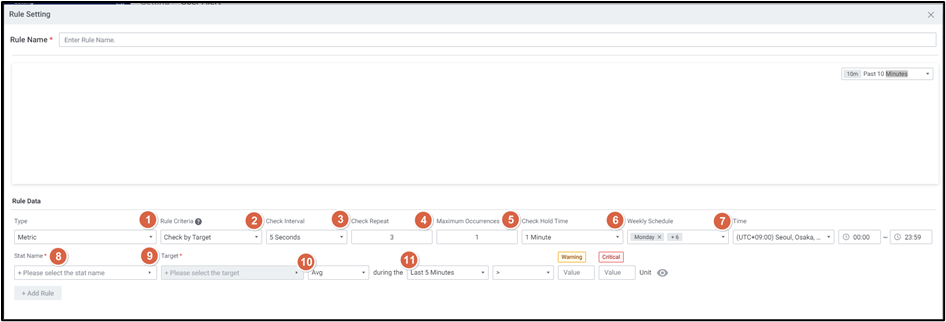 | 11 | Range | 집계 범위를 선택 합니다. Last 5 minutes ~ Last 1 day Critical/Warning 임계값 입력 |