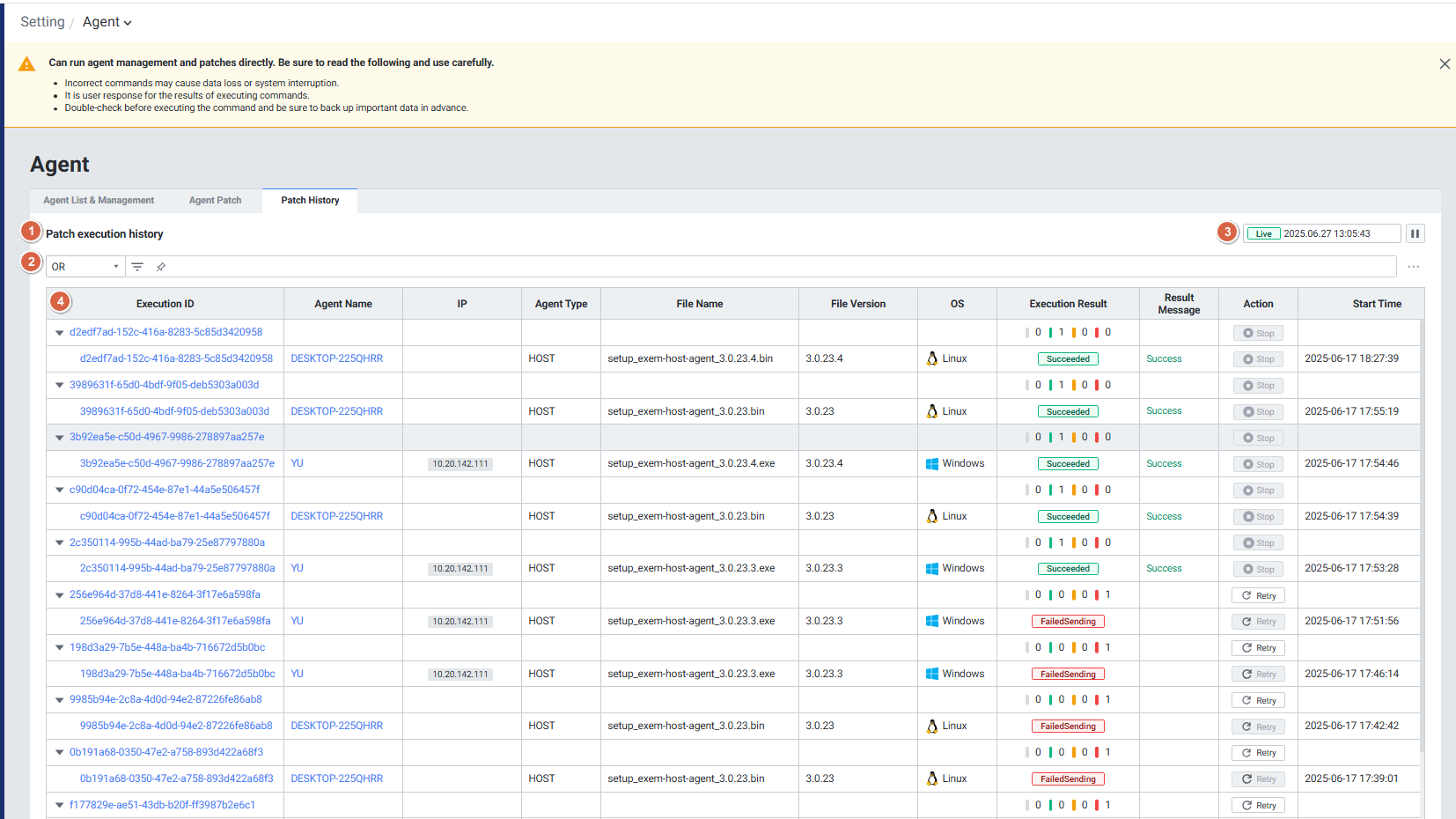 1Patch execution History에이전트 패치 이력을 보여줍니다.