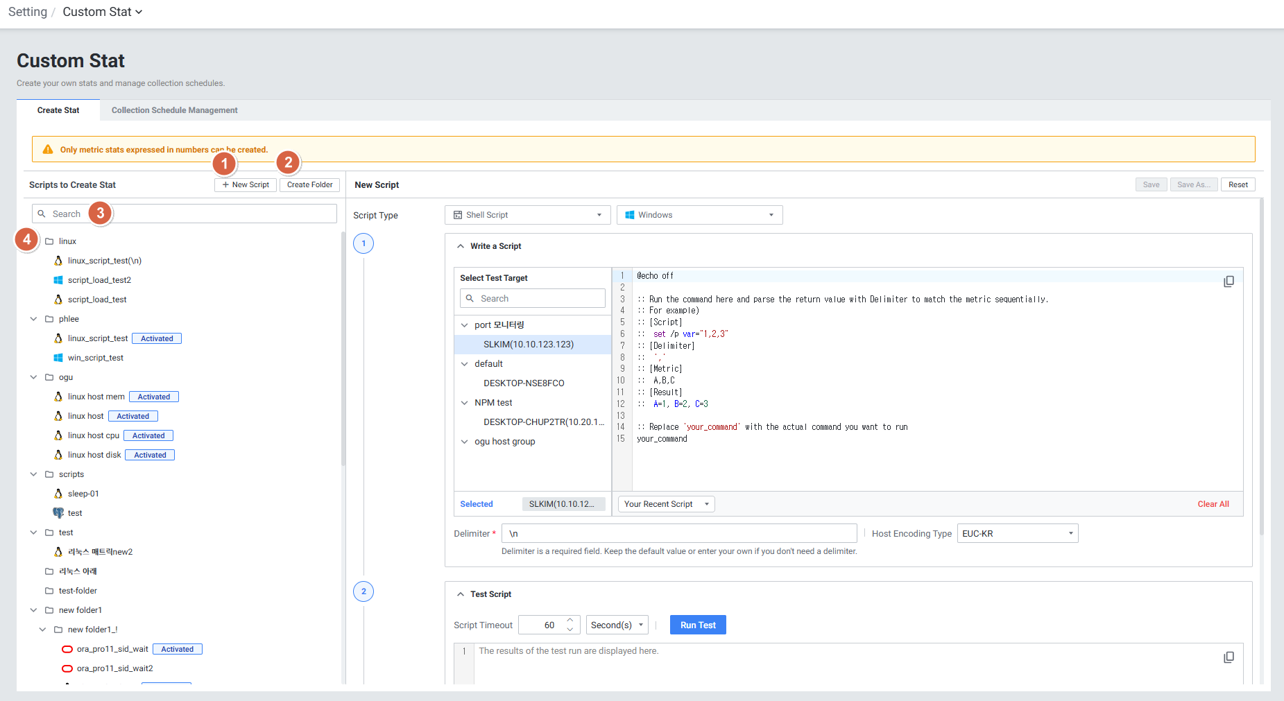 | 12 | Delimiter | Script 결과 출력되는 지표 값 구분자 입니다. 쉼표( ,) 또는 탭(\t) 등 사용 가능 합니다. |