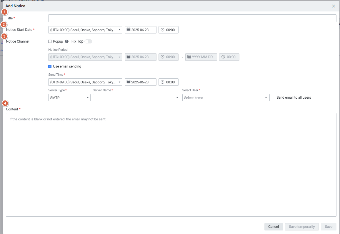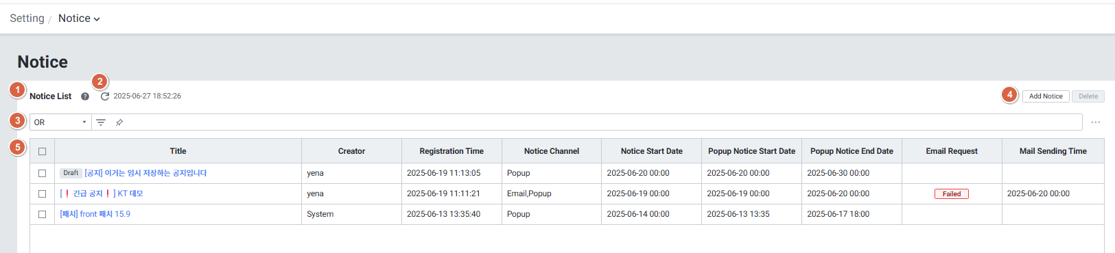 | 5 | column | Title : 공지사항 제목 Creator : 공지 생성자 정보 Registration Time : 공지 수정, 저장 시간 정보 Notice Channel : 알림 채널 정보 Notice Start Date : 공지 시작일 정보 Popup Notice End Date : 팝업 공지 종료일 정보 Email Request : 서버로 메일 발송 명령 전송 여부 정보 Mail Sending Time : 사용자가 설정한 발송 시간 정보 |