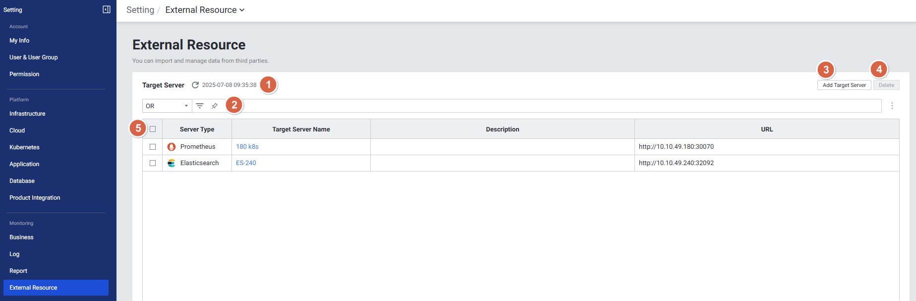 | 5 | Target Server List | Target Server 목록을 Grid 형태로 보여줍니다. Grid 항목 Server Type: Target Server 타입 Target Server Name: Target Server 이름(사용자 지정) Description: Target Server에 대한 설명(사용자 지정) URL: 외부 데이터 접속 정보 |