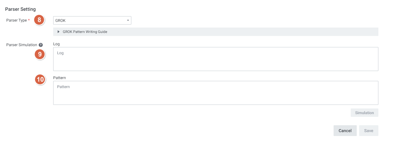 | 9 | Parser Simulation > Log | Log: 실제 로그 내용을 입력합니다. Pattern: 로그의 패턴을 Parser Type에 맞게 입력합니다. |