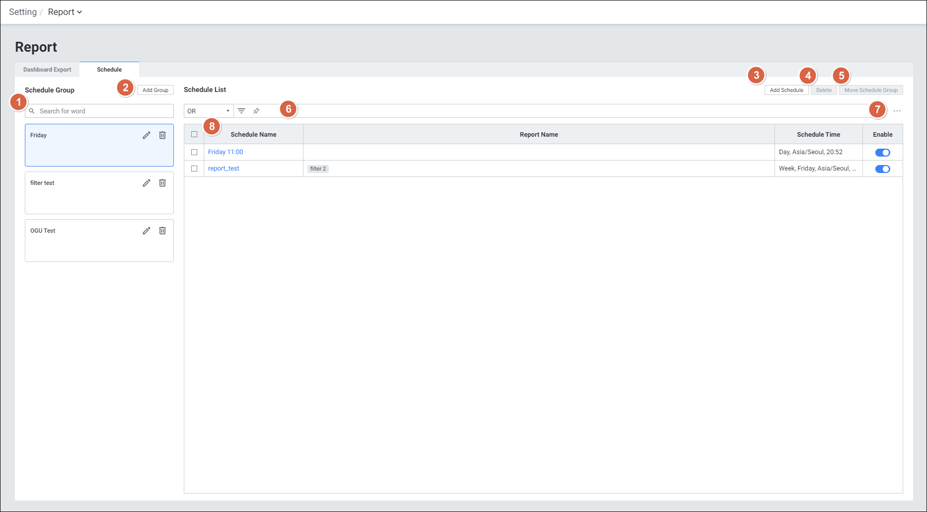 | 7 | Schedule List | Schedule List를 Grid 형태로 보여줍니다. Schedule Name Report Name Schedule Time Enable |