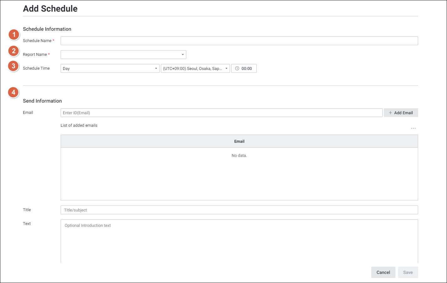 | 3 | Schedule Time | 리포트를 전달할 날짜 및 시간을 설정합니다. |