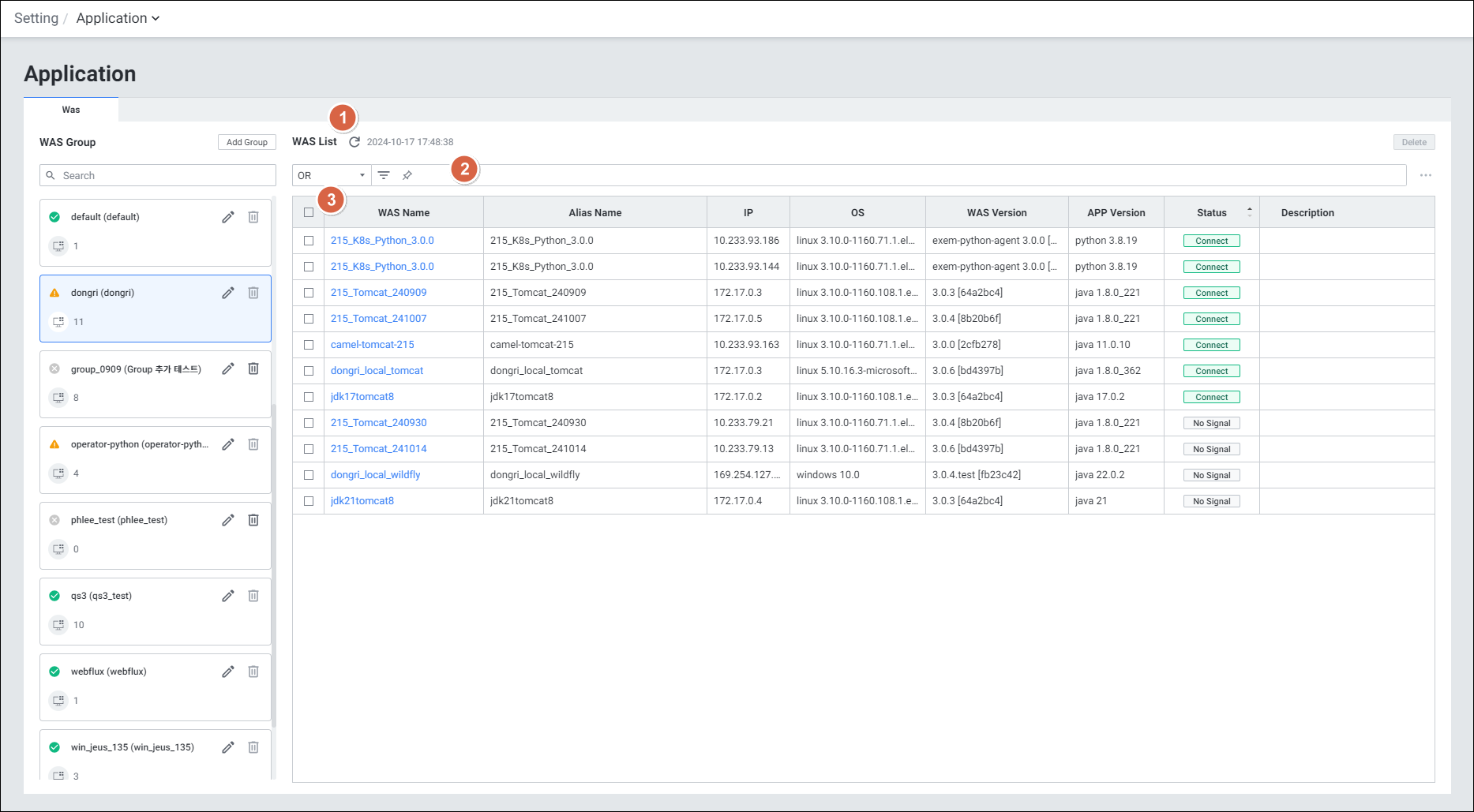| 2 | Filters | 필터 조건에 따라 WAS 목록을 보여줍니다. Or 이나 And 조건으로 선택 가능합니다. |