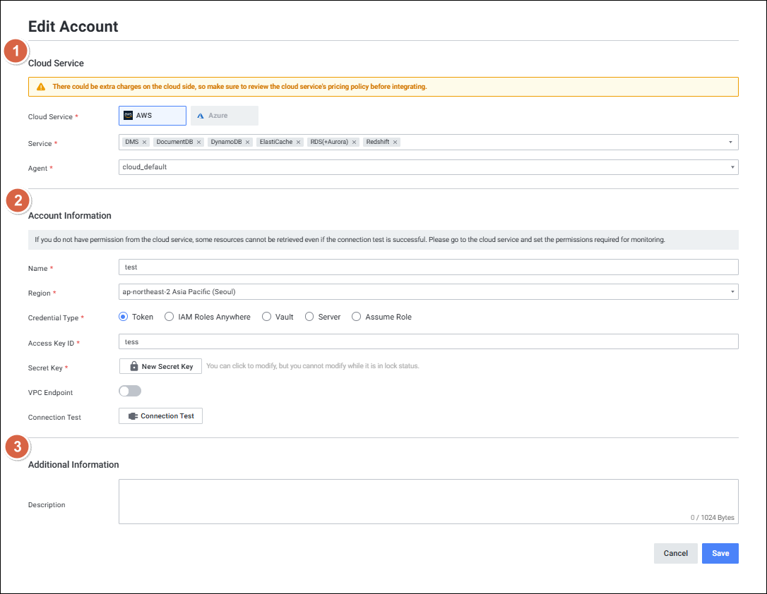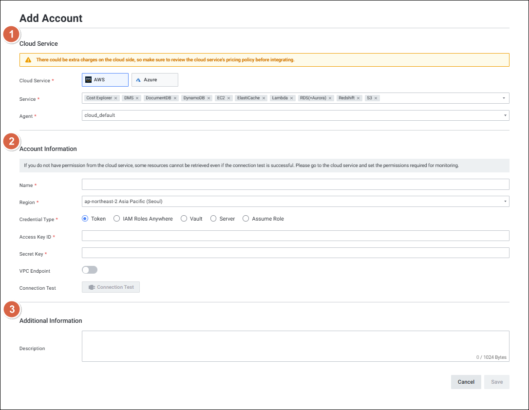 | 3 | Additional Information | 클라우드 서비스 계정에 대한 상세 설명을 설정합니다. |