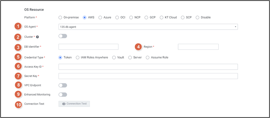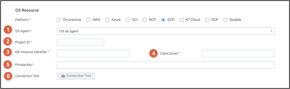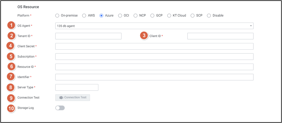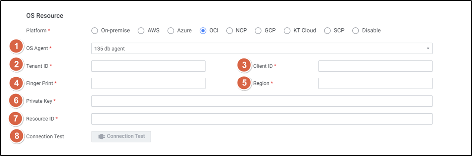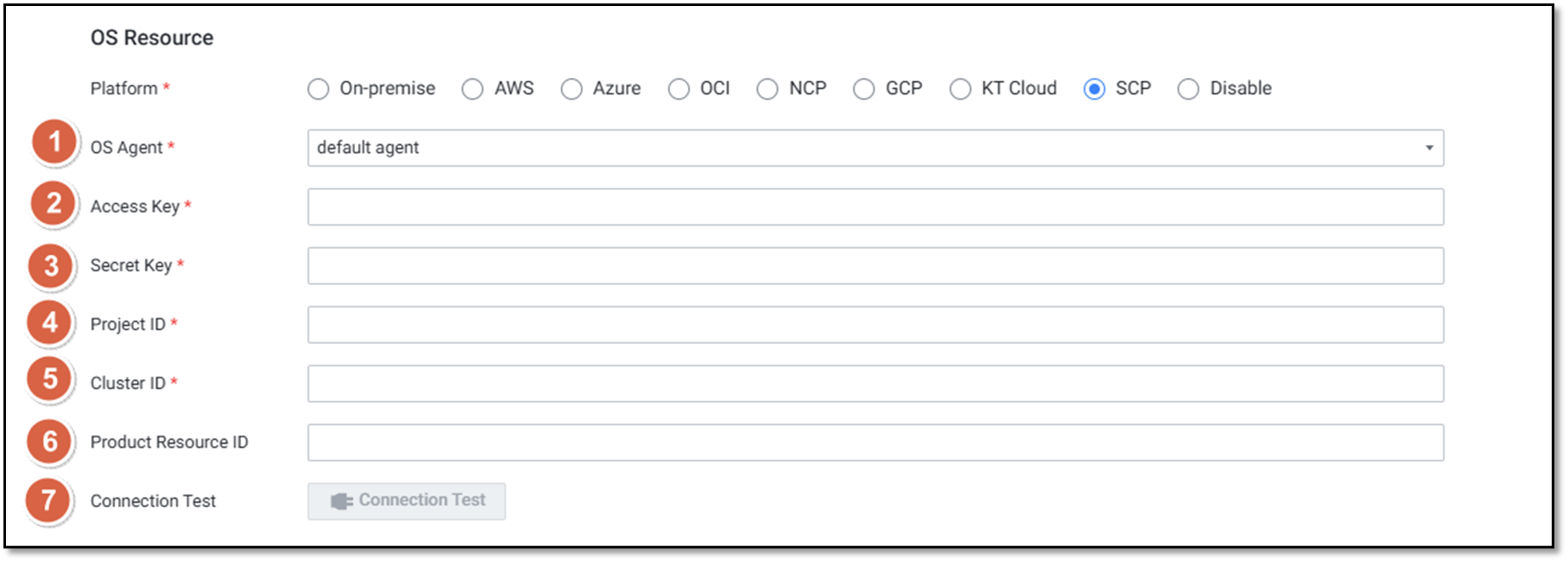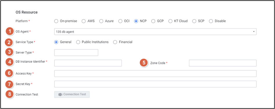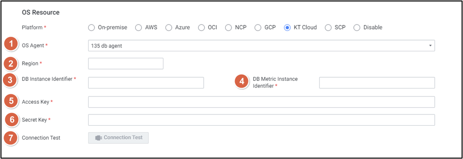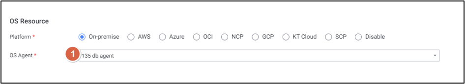 | 2 | OS Resource | OS 수집 설정을 입력합니다. 플랫폼 항목 별 입력 정보가 상이합니다. On-Premise AWS Azure OCI NCP GCP KT Cloud SCP Disable |