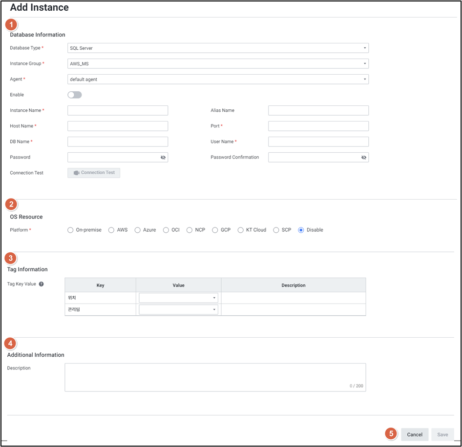 | 5 | Button | Cancel: 인스턴스 추가를 취소합니다. Save: 인스턴스를 저장합니다. |