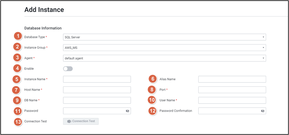 | 13 | Connection Test | 필수 정보를 모두 입력하면 버튼이 활성화됩니다. 데이터베이스 연결이 가능한지 테스트를 실행합니다. |